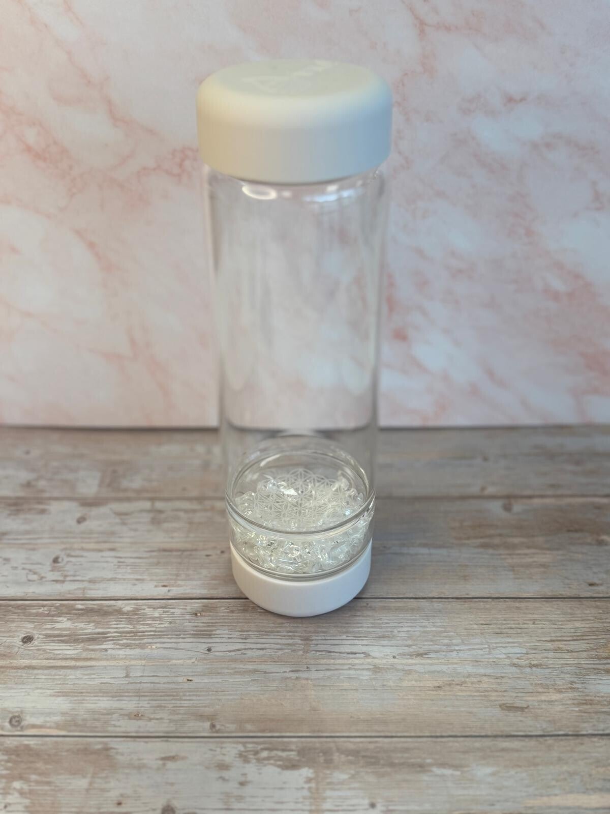 Besonders schön: Die Edelsteinkammer ist durch eine Glasplatte von der eigentlichen Flasche getrennt, in die die Blume des Lebens graviert ist – ein Symbol für Harmonie und Vollkommenheit. Die enthaltenen Steine stammen von Lapis Vitalis und stehen für geprüfte, hochwertige Therapiesteinqualität.
