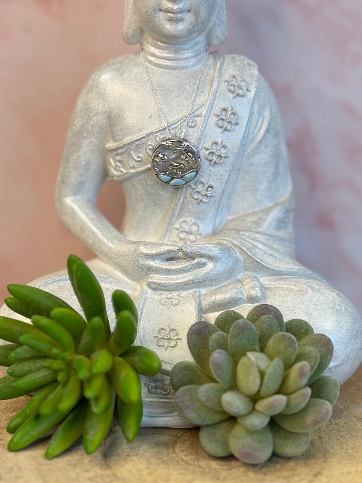 Der runde Anhänger besteht aus rhodiniertem, hochglanzpolierten 925er Silber und besticht durch seine detailreiche Verarbeitung. Der sanft blaue Larimar, auch „Stein der Karibik“ genannt, harmoniert perfekt mit den feinen, facettierten Topasen, die einen zarten Glanz verleihen.